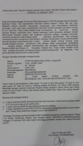TUAL. Evav-Terkini.com Polres Tual melalui Sat Narkoba berhasil mengamankan Salah satu mahasiswa yang dengan sengaja menjual, menyimpan...