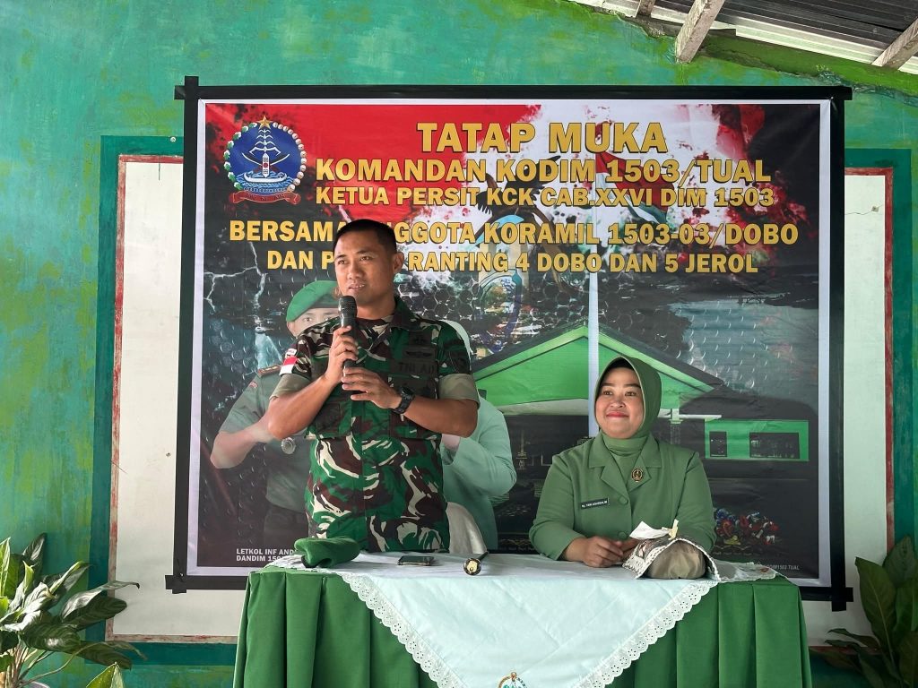 Komandan Kodim 1503/Tual, Letkol Inf Andi Agussalim, S.I.P., M.I.P., didampingi Ketua Persit Kartika Chandra Kirana Cabang XXVI Dim 1503, Ny. Yani Andi Agussalim, melaksanakan kunjungan kerja di Koramil 1503-03/Dobo, Selasa (16/7/2025).