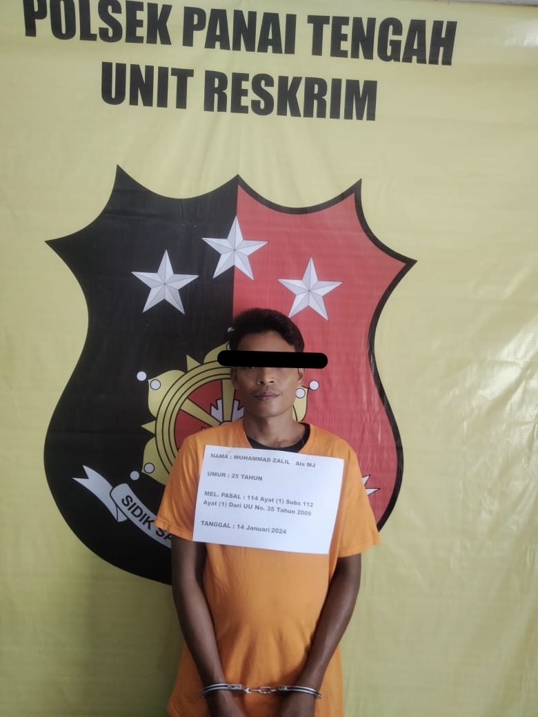 Setelah di TKP, Kanit Reskrim Polsek Panai Tengah Ipda Ricardo Sirait ,SH beserta personil lainnya langsung mengamankan pelaku berikut barang bukti berupa 1 bungkus plastik Sedang tembus pandang berisi butiran kristal diduga narkotika jenis sabu,1 buah alat hisap sabu (bong) dari botol minuman, 1 buah kaca pirex, 3 buah pipet dan 1 buah tas pinggang.