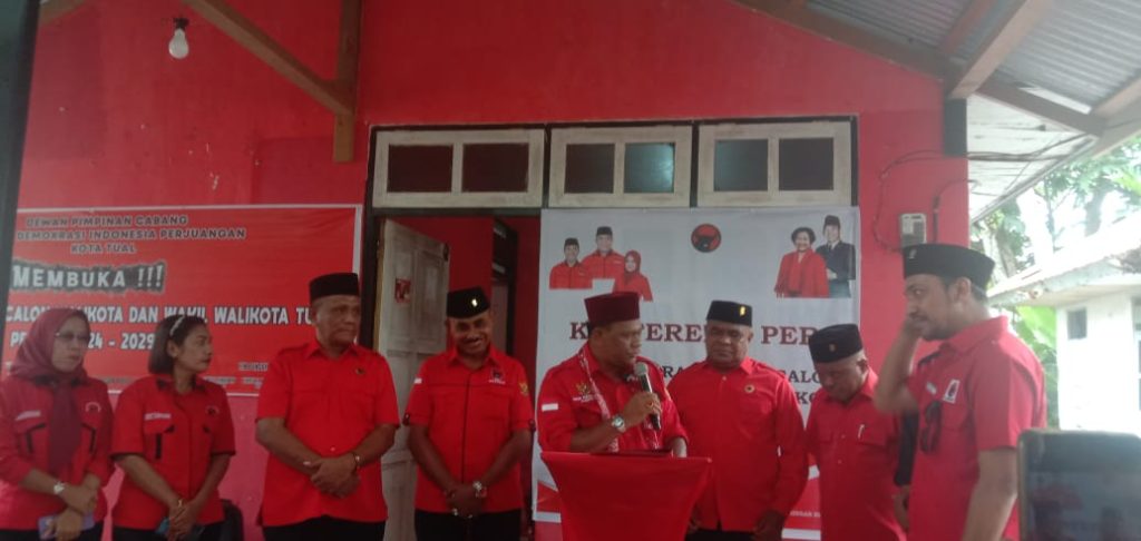 Dihadapan media Pers depan Sekretariat PDI-Perjuangan Kota Tual, Baharudin Farawowan yang telah menyelesaikan administrasi menyampaikan pidato politik yang mengusung konsep “Tualku, Lautku,” memberikan gambaran secara kondisi geografis daerah bertajuk Kota Mutiara itu.