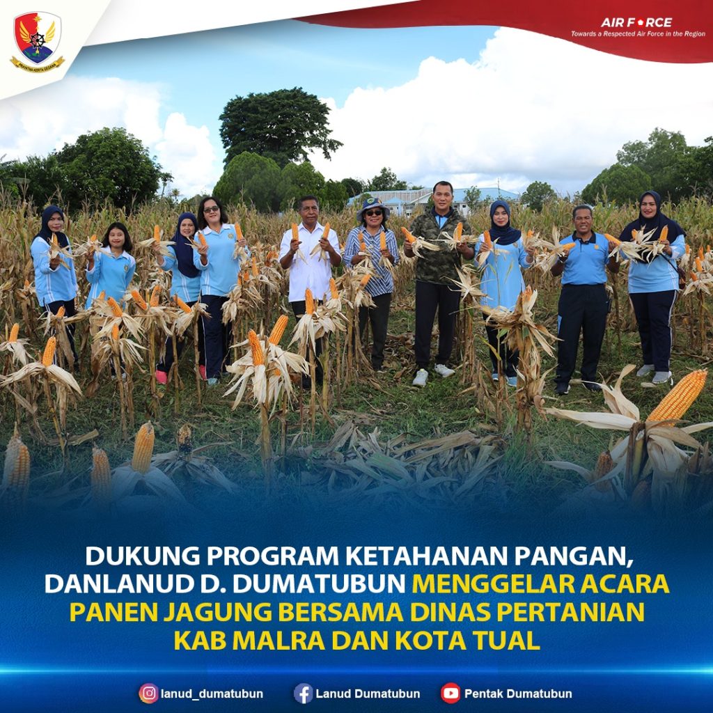 Turut hadir Kepala Dinas Pertanian Kabupaten Maluku Tenggara Bapak Felix Tethool dan Kepala Dinas Pertanian Kota Tual Ibu Irene Ngabalin yang bersama-sama ikut memanen Jagung di ladang Ketahanan Pangan Lanud DMN.