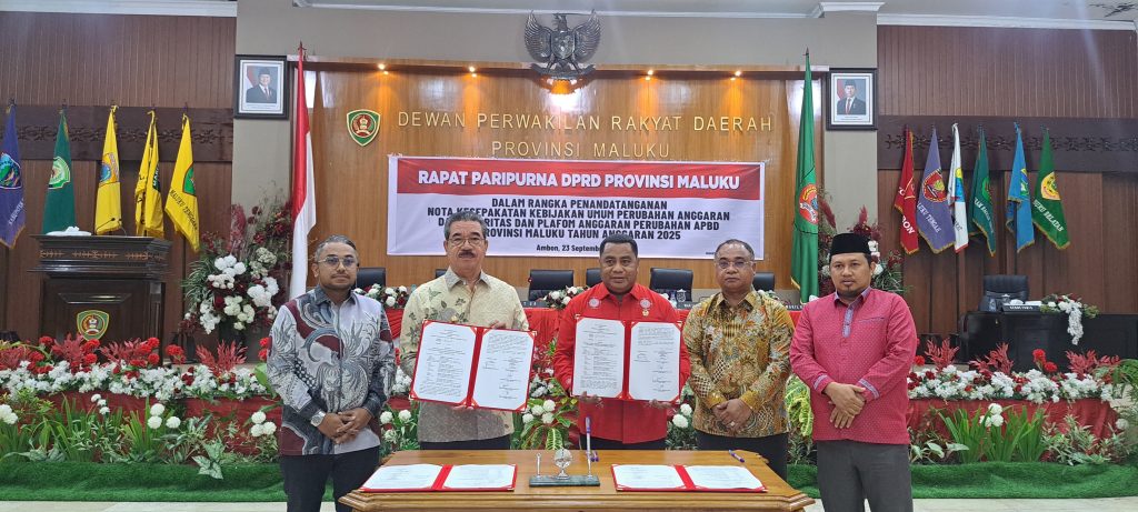 Gubernur Hendrik Lewerissa bersama Ketua DPRD Benhur Watubun resmi menandatangani nota kesepakatan Kebijakan Umum Perubahan Anggaran (KUPA) dan Prioritas Platform Anggaran Perubahan (PPAP) APBD Provinsi Maluku Tahun Anggaran 2025. Yang berlangsung ruang Rapat paripurna DPRD Provinsi Maluku, Selasa, (23/9/2025).