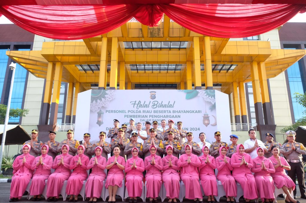 Dalam rangka silaturahmi seusai perayaan Idul Fitri 1445 H, Polda Riau menggelar halal bihalal di halaman depan Markas Polda Riau, Jalan Pattimura, Pekanbaru, Senin (22/4/2024).
