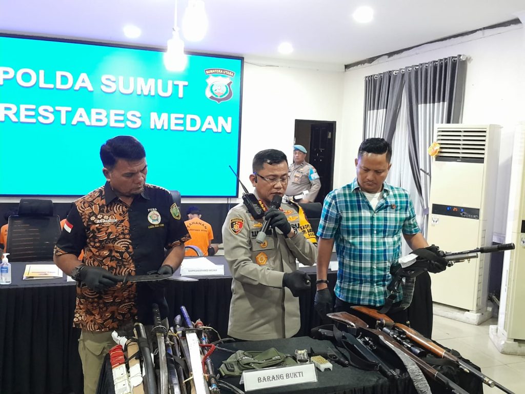 Kapolrestabes Medan memaparkan keberhasilan anggota Polrestabes Medan amankan para pelaku oknum Ormas yang ingin serang warga dengan senpi dan samurai, Selasa (5/2/2024).