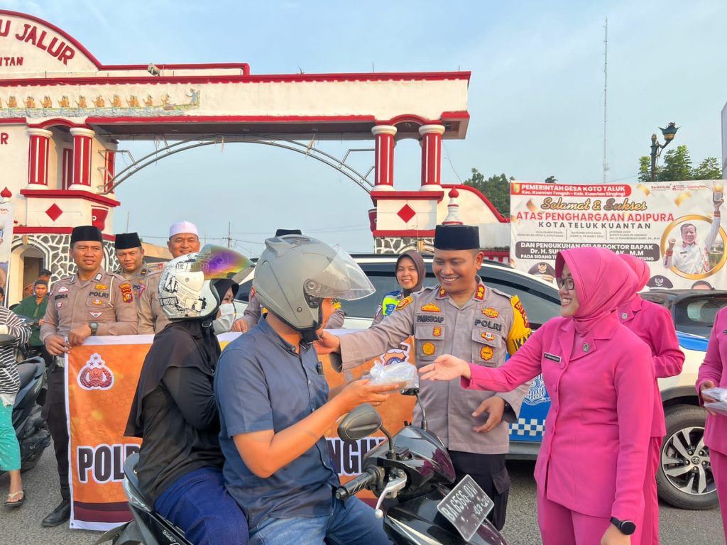 Kapolres Kuansing bersama Satuan Lalu Lintas (Sat Lantas) Polres Kuansing menggelar kegiatan pemberian takjil gratis kepada pengendara dan penumpang sepeda motor yang menggunakan helm. Jumat, (15/3/2024), sekitar pukul 16.30 WIB.