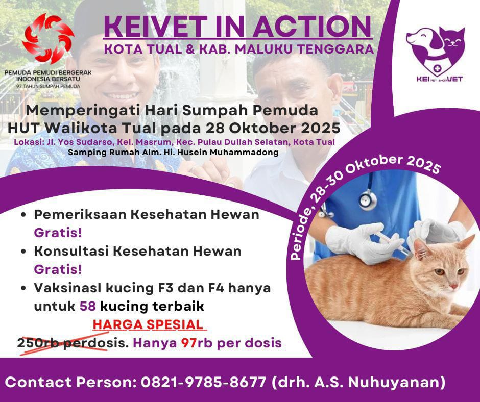 Kegiatan yang berlangsung selama tiga hari, 28–30 Oktober 2025, ini menghadirkan berbagai layanan kesehatan hewan gratis dan promo spesial bagi masyarakat pecinta hewan di Kota Tual dan Kabupaten Maluku Tenggara.