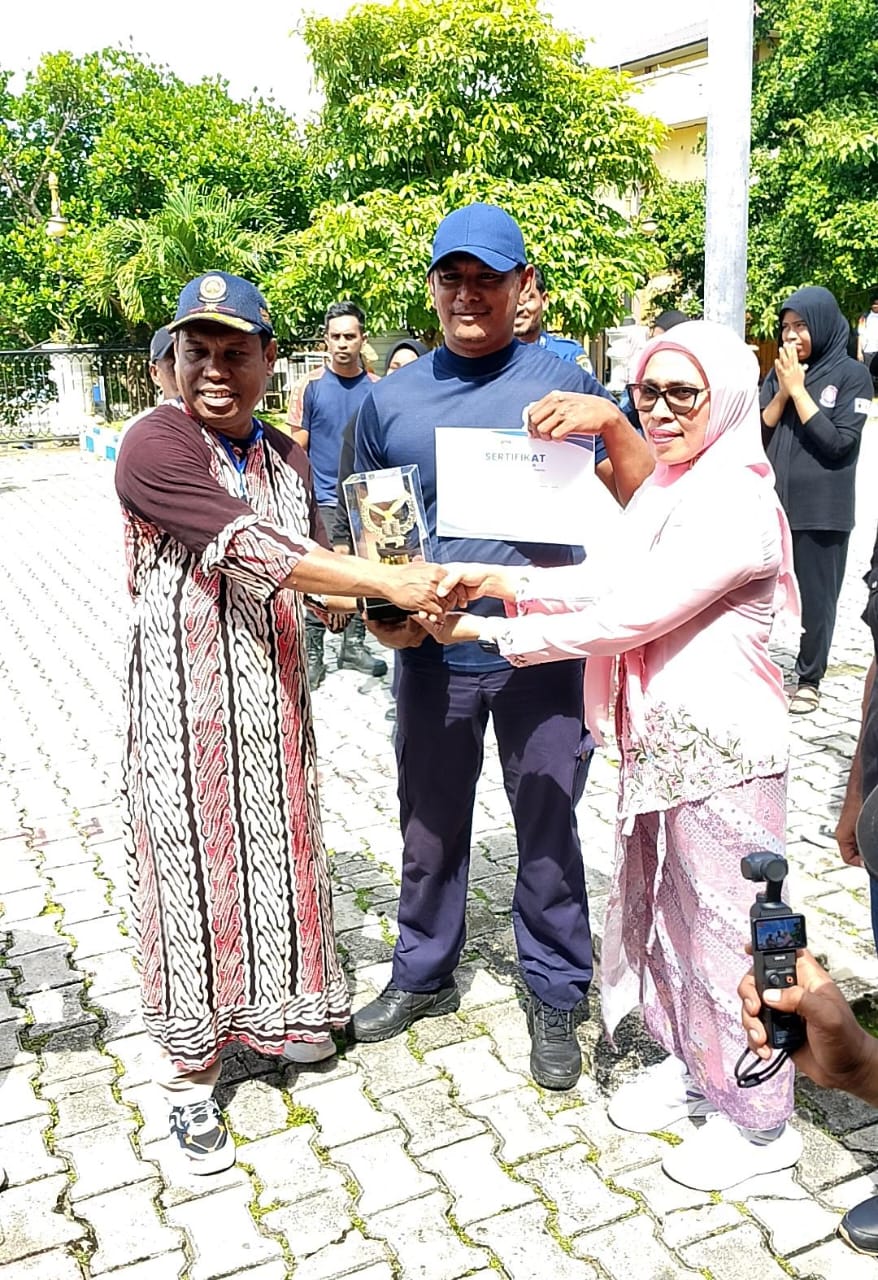 Ketua panitia Rini Atbar ” menyerahkan Hadiah kepada Kepala dinas pemadam kebakaran Kota Tual Jamal Renhoat meraih juara satu 1 dengan hadiah piala dan sertifikat.