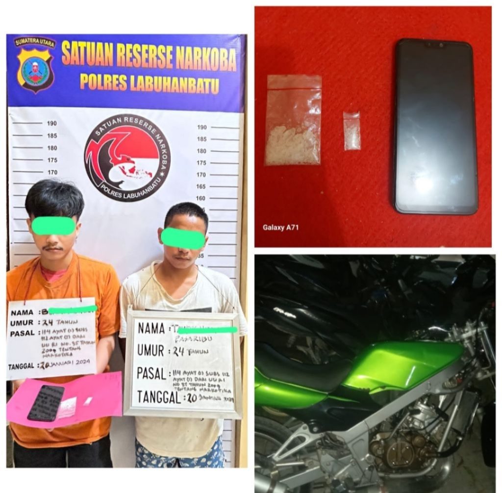 Adapun barang bukti yang diamankan dari kedua tersangka yakni 2 (dua) bungkus plastik transparan berisi sabu seberat 3,79 gram bruto, 1 (satu) unit HP android Asus warna hitam, 1 ( satu ) unit Sp. motor Kawasaki BK.2488-AJF , keseluruhan telah dibawa ke Mapolres Labuhanbatu.
