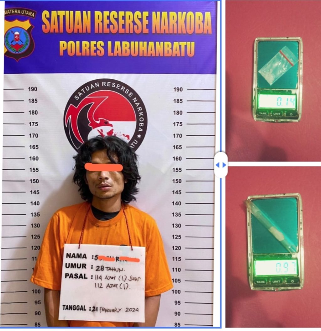 Nekat jual narkotika jenis sabu, oknum pengedar sabu berinisial SR (28) warga Dusun Kandang Lembu Jalan Lurus Kelurahan Pulo Padang Kecamatan Rantau Utara Kabupaten Labuhanbatu diciduk Tim Opsnal Satres Narkoba Polres Labuhanbatu Jumat (23/2/2024).