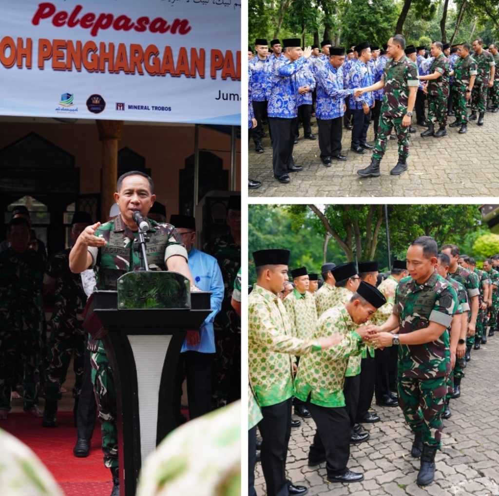 Panglima TNI Jenderal TNI Agus Subiyanto melepas jamaah Umroh penghargaan Panglima TNI sebanyak 285 personel, yang dihadiri oleh seluruh Pejabat Utama Mabes TNI, dilaksanakan di halaman Masjid Sudirman Mabes TNI, Cilangkap, Jakarta Timur. Jumat (23/2/2024).