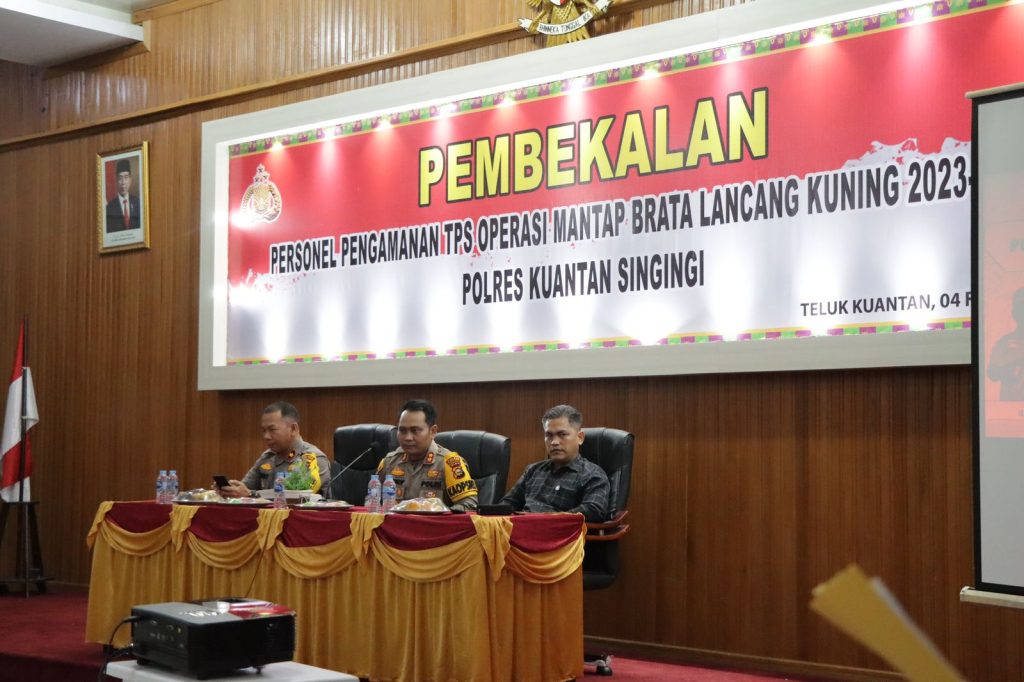 Polres Kuansing gelar pembekalan Personil Pengamanan TPS Ops Mantap Brata Lancang Kuning 2023-2024 Polres Kuansing dalam menjalani masa persiapan Pemilihan Umum (Pemilu) 2024 yang aman dan damai diwilayah kabupaten kuansing, pembekalan dilaksanakan di Aula Sanika Satyawada Polres Kuansing pada Minggu (4/2/2024).