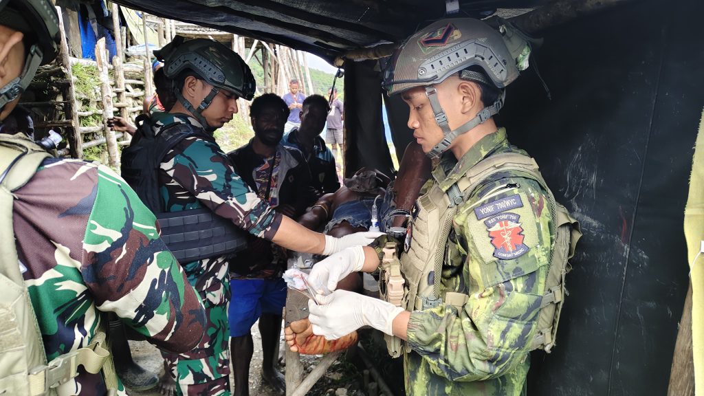 Tanpa ragu, Serda Lijan, seorang prajurit kesehatan dari Bakes Pos Pintu Jawa, sigap memberi pertolongan. Di bawah tenda sederhana dan pencahayaan alami, tangan-tangan bersarung putih bergerak lincah menjahit luka—bukan hanya di kulit, tetapi juga luka di batin warga yang rindu akan rasa aman dan kepedulian.