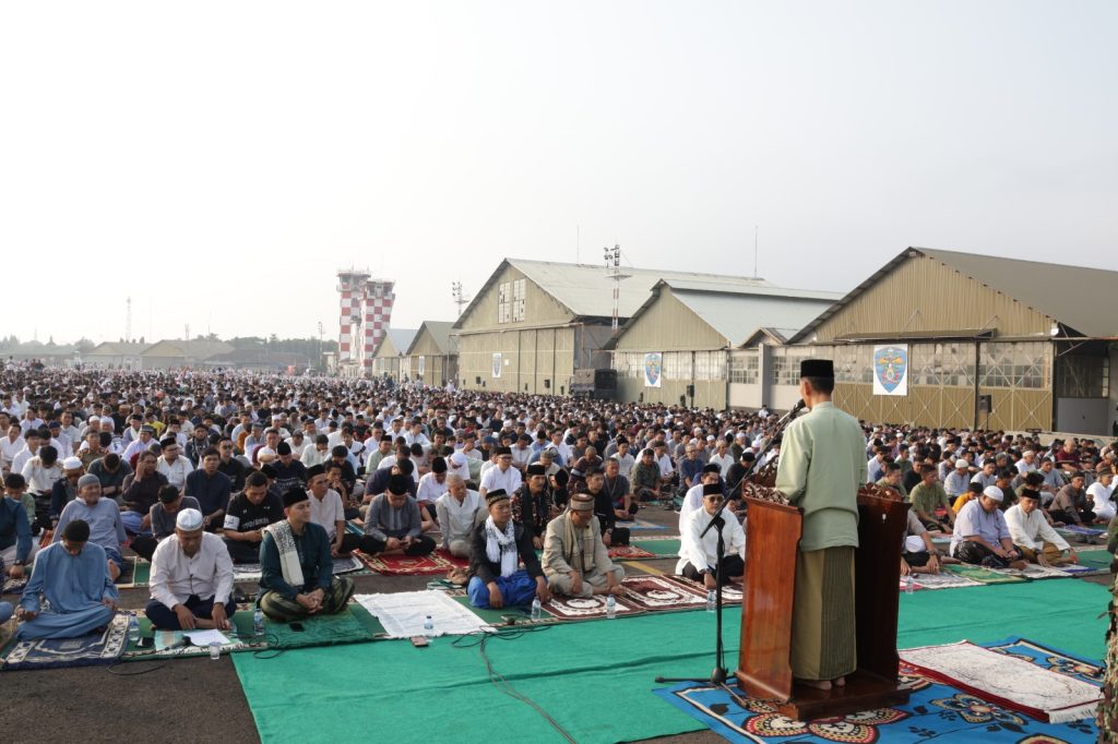 Ribuan umat muslim mengikuti sholat Idul Fitri 1445 H, yang digelar oleh Lanud Husein Sastranegara, bertempat di Apron Lanud Husein Sastranegara, Rabu (10/9/2024). Bertindak selaku Imam dan Khotib pada pelaksanaan Sholat Idul Fitri kali ini adalah Ustad H. Mamat Rohimat S.Ag.