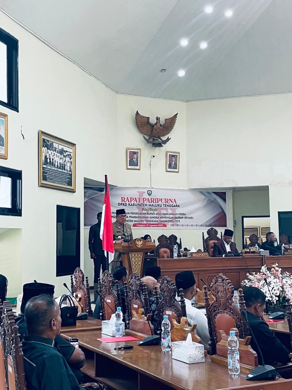 Bupati Maluku Tenggara Drs.M.Thaher Hanubun dalam sambutanya pada rapat paripurna DPRD kabupaten Maluku Tenggara dalam agenda tanggapan pandangan umum fraksi terkait RPJMD berkomitmen akan memimpin langsung RPJMD secara Integratif.Rapat Paripurna berlangsung di ruang sidang dprd Selasa 12/8/2025.