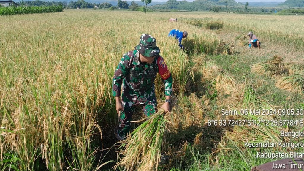Sebagai bentuk nyata dukungan terhadap ketahanan pangan di wilayah binaannya, pagi ini Serda Suhartono Babinsa Koramil 0808/03 Kanigoro, melaksanakan kegiatan membantu panen padi di sawah warga binaannya, yang berlokasi di Desa Banggle Kecamatan Kanigoro Kabupaten Blitar, Senin (6/5/2024).