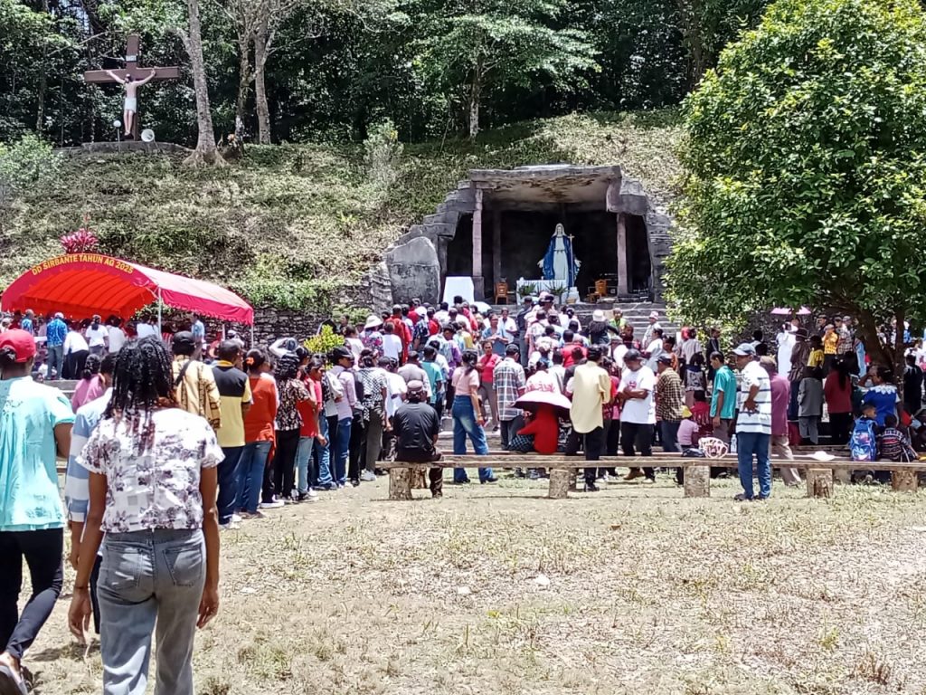 Umat Katolik separoki Hati Kudus Yesus Bombay melaksanakan Misa Penutupan Bulan Rosario, kegiatan ritual keagamaan tersebut berpusat di Goa Bunda Maria bukit Indah Gunung Dab, Jumat 31 Oktober 2025.