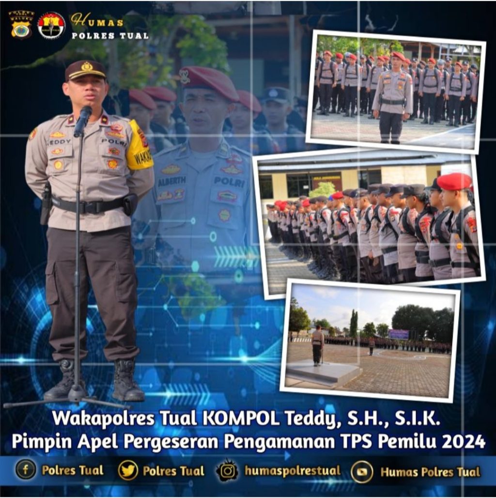 Dalam rangka pengamanan Pemilu Tahun 2024, Polres Tual melaksanakan Apel Pergeseran Pasukan (Serpas) Pengamanan TPS di Lapangan Apel Polres Tual, Minggu (11/2/24) sekira pukul 08.00 Wit