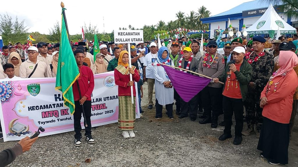 Sesuai pantauan Media ini “Wakil Walikota Tual H.Amir Rumra Melepas Pawai Ta’aruf Musabaqah Tilawatil Qur’an (MTQ) ke-IX tahun 2025 di pelabuhan Yamtel pada 6/10/2025.
